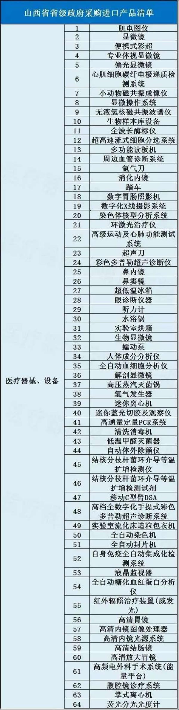 而在此之前,山西省政府采購網(wǎng)發(fā)布《山西省省級政府采購進口產(chǎn)品清單》(簡稱《進口產(chǎn)品清單》),其中67種醫(yī)用設(shè)備產(chǎn)品被納入允許采購進口清單。