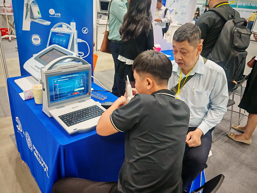 展會期間,品源醫(yī)療展臺憑借清晰的功能分區(qū)與沉浸式互動體驗(yàn),成為展會人氣最旺的展臺之一。展臺以 “精準(zhǔn)檢測?守護(hù)健康” 為主題,精心劃分產(chǎn)品體驗(yàn)區(qū)、技術(shù)交流區(qū)與合作洽談區(qū),通過 “現(xiàn)場演示 + 案例分享 + 一對一咨詢” 的立體化互動模式,與越南醫(yī)療機(jī)構(gòu)、經(jīng)銷商、行業(yè)專家展開多維度深度溝通,為后續(xù)中越醫(yī)療合作奠定堅(jiān)實(shí)基礎(chǔ)。